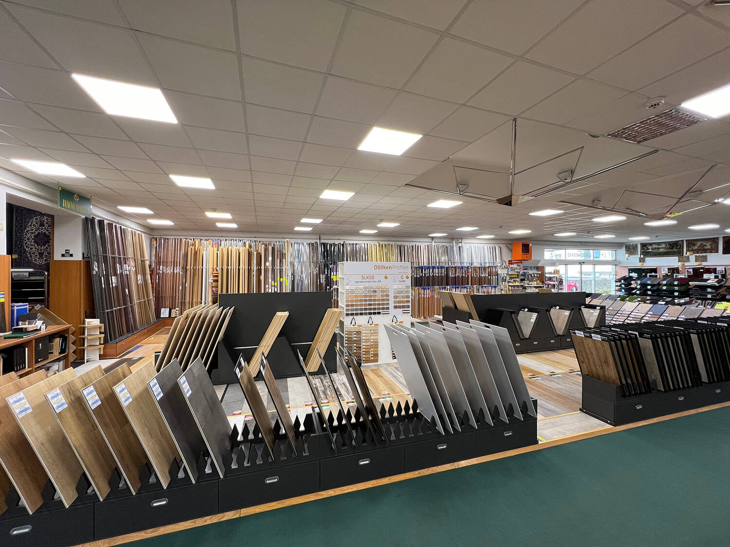 Jedná se zejména o lepené vinylové dílce, plovoucí vinyl v clicku, kompozitní a SPC rigidní vinylové podlahy, třívrstvé dřevo a korek. Celé to skvěle navazuje na vedlejší oddělení přechodových lišt a profilů. V prostoru je také nainstalovaný stojan soklových lišt Döllken pro "orámování" místností. Takže všechny důležité detaily k podlaze najdete na jednom místě.